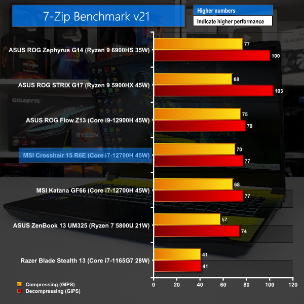 7-Zip performance is very similar to the 12700H in the Katana. But once again, AMD’s 35W- and 45W-class Ryzen chips are notably quicker.