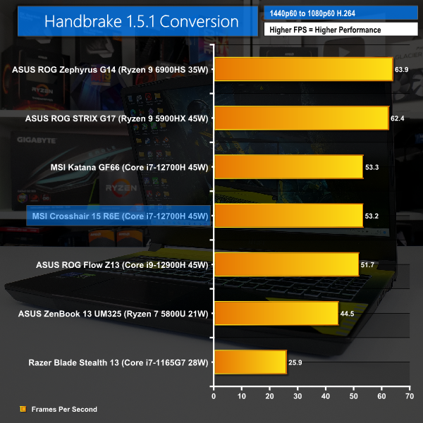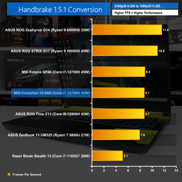 Handbrake shows a similar trend – Ryzen competition is much faster than the Core i7-12700H in MSI’s roughly 38W sustained power mode. Unsurprisingly, that’s the same for Handbrake H265 too.