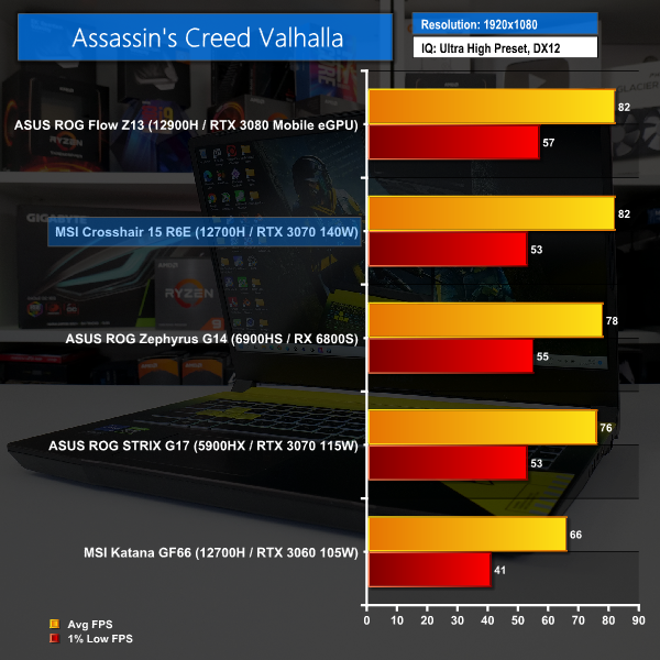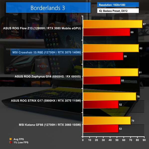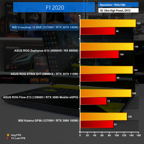 Starting out with 1080p performance against the competing laptops, we see Assassin’s Creed Valhalla running at a comfortable 82 FPS average on the Crosshair 15 R6E. Borderlands 3 also sees the 140W RTX 3070 flex its muscle with 1% low FPS numbers almost hitting the golden 60 FPS level. F1 2020 is well into the range of pushing this high refresh rate display at its nominal 165Hz preference.