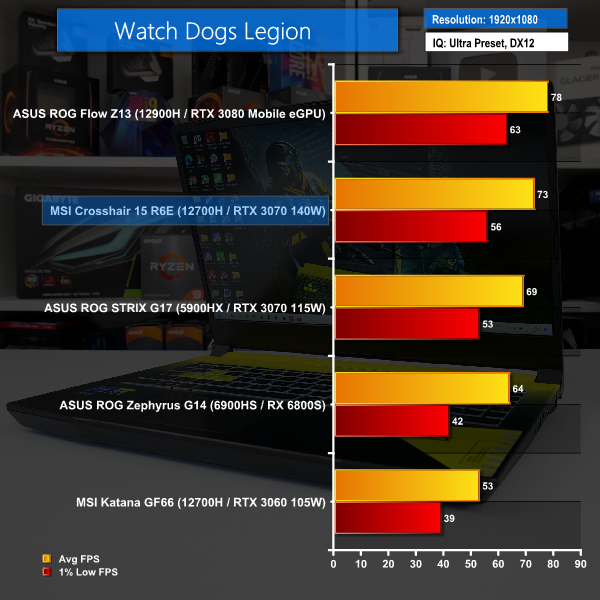 Far Cry 6 is far more CPU-biased, though, and struggles to outperform on the Crosshair 15 R6E and its 12700H versus the Ryzen competitors with slower GPUs. Normal order is resumed in Shadow of the Tomb Raider, with the 12700H and RTX 3070 140W combining for an average FPS above 120. And Watch Dogs Legion results in another second-place finish for the Crosshair 15 R6E, with only the Core i9 and high-power RTX 3080 eGPU ASUS solution being quicker.