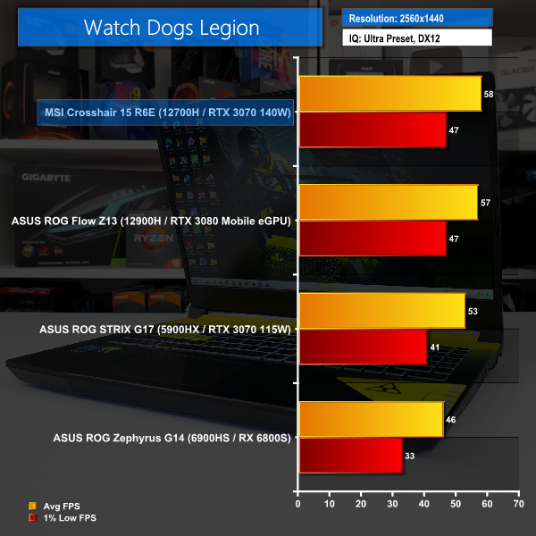 MSI’s Crosshair 15 R6E does very well in our 1440p gaming test and scores higher than we anticipated even versus the ASUS RTX 3080 solution – albeit an eGPU solution.