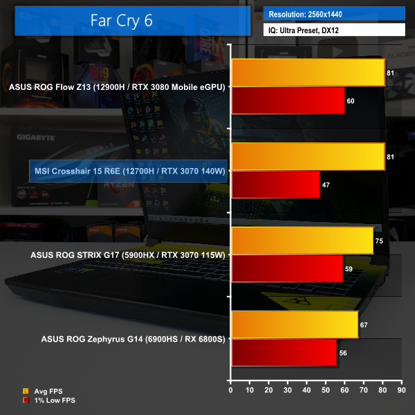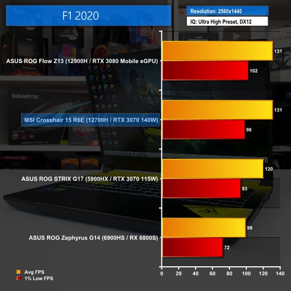 With the limitations of an external GPU link not an issue, MSI’s Crosshair 15 R6E does very well to match the 131 FPS average of ASUS’ RTX 3080 eGPU solution in F1 2020. Far Cry 6 performance is also very strong on the average, but limitations of the CPU power budget result in far less competitive 1% Low FPS values.