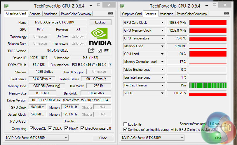The GTX 980M is able to turbo its core clock as high as 1126MHz, although the operating clock speed stays largely constant at 1088MHz after extended loading periods. The 8GB of GDDR5 memory remained clocked at 1253MHz throughout its loading period.