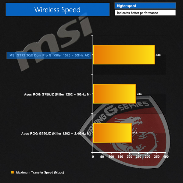 Killer's 802.11ac wireless chipset shows solid transfer rates when located in close proximity to the wireless router. The same vendor's Wireless-N 1202 chipset simply cannot compete with the level of performance shown by the 1525 solution.