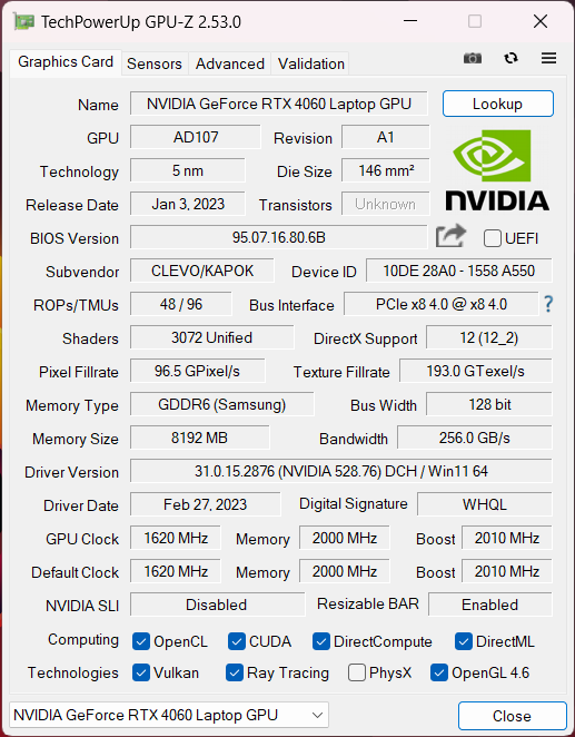 - Video Graphics – Intel® Iris Xe Graphics, NVIDIA® GeForce RTX™ 4060 Laptop GPU 8GB GDDR6 Boost Clock 2010MHz / Maximum Graphics Power 75W