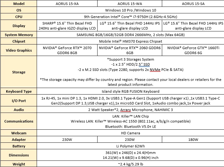 As you would expect, the Aorus 15 also makes the jump to 9th Gen Intel processors. While there are multiple models for this laptop, the Core i7-9750H can be found inside all of them. The main difference here will be the display and the GPU, with a GTX 1660Ti and a 1080p/144Hz display coming in the entry level version and an RTX 2070 with a 240Hz display in the flagship model.