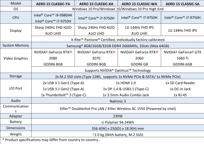 There are four different versions of the Aero 15 Classic with different specs, ranging from 9th Gen Core i7 to Core i9. There is a range of GPU options too, with the GeForce GTX 1660Ti at the bottom, going all the way up to an RTX 2080. You can see the full spec of each model in the image above.