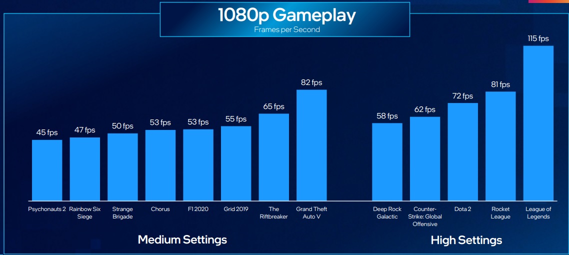 In terms of gaming, Intel shared a series of 1080p benchmarks at medium and high graphical settings. For esports games, you an expect solid performance from the iGPU, allowing for 60+ FPS in CS:GO, Dota 2, Rocket League etc. In addition, we see solid performance in titles like GTA V, although the iGPU does struggle with some games, as we see with Rainbow Six Siege, which only nets 47FPS in Intel's benchmark at 1080p/medium. With that in mind, enthusiast gamers are still going to want to pick up a laptop with discrete graphics to run demanding titles.