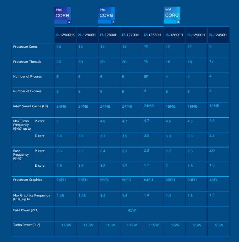 In the gallery above, you can see all of the specs for the H-series, P-series and U-series Intel 12th Gen Core Mobile processors. As we can see, at the top-end, we have the Intel Core i9-12900HK, offering 14 cores (6 P-cores, 8 E-cores), 20 threads, 24MB of L3 cache and up to 5GHz boost speeds on the P-Core. By comparison, the Core i7-12800H processor offers the same cores, threads and cache, but has a lower boost speed, capping out at 4.8GHz.