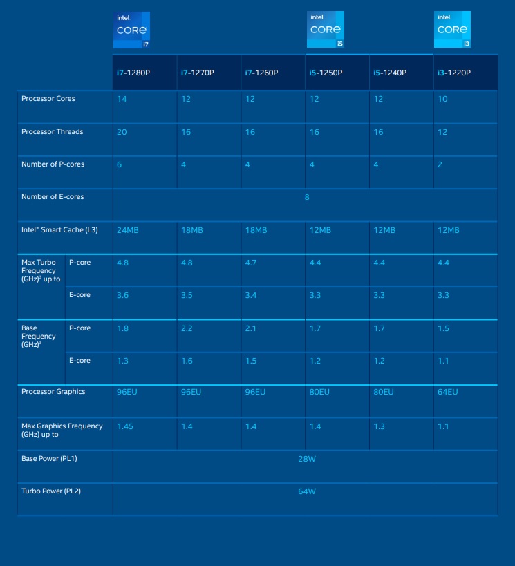All of Intel's 12th Gen Core Mobile processors come with an iGPU based on the Xe architecture. The top processors in the H, P and U-series all come with an iGPU with 96 Execution Units, although clock speeds differ, as you can see in the spec tables. The number of Execution Units scales down to a minimum of 48 EUs for the entry-level processors in each stack.
