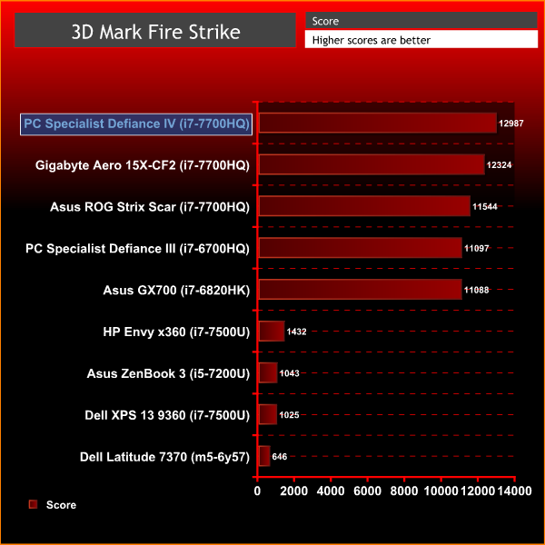 Its Fire Strike result of 12,987 is more than 1,000 points ahead of the Asus ROG Strix Scar, which is no surprise – the GTX 1070 is a clear step ahead of the GTX 1060 inside the Asus machine.