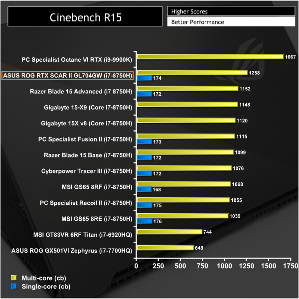 ASUS deploys the very popular i7-8750H CPU with the GL704GW which has six physical cores, twelve threads and has a peak turbo frequency of 4.1GHz with a base frequency of 2.2GHz. With the ASUS implementation the multi-core performance is slightly higher than similarly equipped laptops, probably due to ASUS running the laptop with more power consumption which enables the CPU to operate faster. Single core performance is the same.