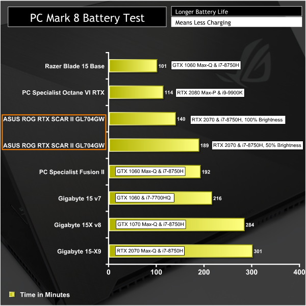 Battery life is, unexpectedly, pretty low with the user able to get around 2 to 3 hours of medium home usage. During gaming the battery life would be considerably less but users should be plugging in when gaming so the CPU and GPU can run at full frequency. At 17.3″ in size, the ROG STRIX RTX SCAR II is hardly meant to be a portable gaming machine so keeping it plugged it is almost a given.