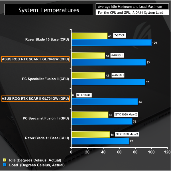 System temperatures are perfectly reasonable. The CPU runs in the mid-90s but did not throttle, however, 90-100 degrees for the Intel Core i7-8750H is actually standard fare. The GPU ran fairly warm too, around 83 degrees Celsius which is maintained through “GPU Boost” frequency control. At idle the GPU switches off, hence the 0.