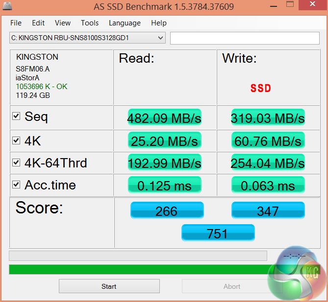 We used AS SSD as a final test on the Kingston Solid State drive. The final score of 751 points is healthy.