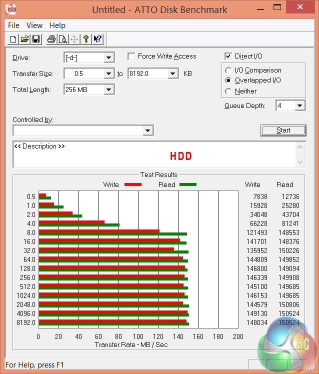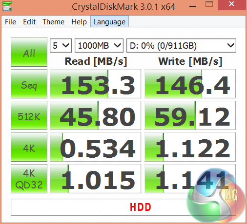 CrystalDiskMark highlights strong performance from the Kingston drive, hitting peaks of close to 500 MB/s in the sequential read test. Write performance is a little lower, but perfectly acceptable. MSI have included a fast 7,200 rpm hard drive in the MSI GE62 2QD, and it scores around the 150MB/s mark in both sequential read and write tests.