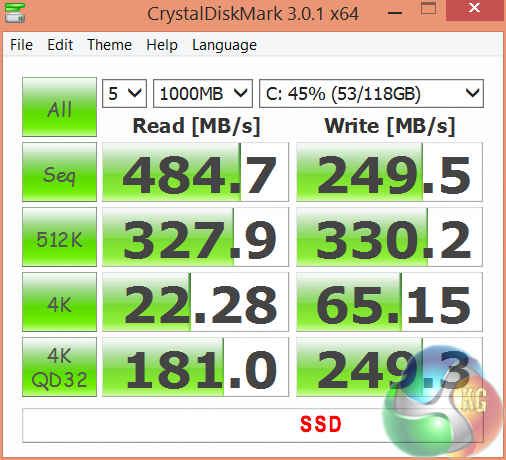 ATTO highlights excellent performance characteristics from the Solid State drive, hitting 550 MB/s read and 500 MB/s write.