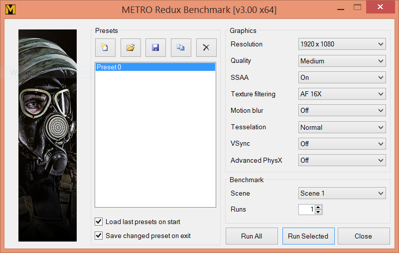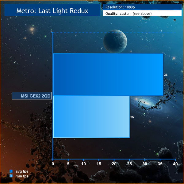 On May 22, 2014, a Redux version of Metro Last Light was announced. It was released on August 26, 2014 in North America and August 29, 2014 in Europe for the PC, PlayStation 4 and Xbox One. Redux adds all the DLC and graphical improvements. A compilation package, titled Metro Redux, was released at the same time which includes Last Light and 2033. (Wikipedia). We test with following settings at 1920×1080: quality medium, SSAA on, 16AF, Tessellation NORMAL, VSYNC off and Advanced PhysX off.