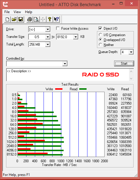 The SSD Raid 0 configuration hits around 1000 MB/s in the read test, and the mechanical hard drive hits a limit around 136 MB/s.