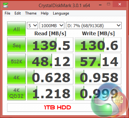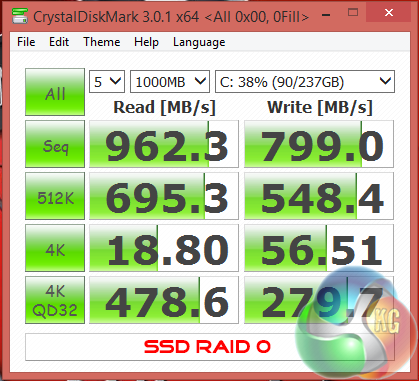 The Raid 0 SSD configuration works extremely well, hitting 962 MB/s and 799MB/s in the sequential read and write tests, respectively. The mechanical drive is much slower, however for a 7,200 rpm 2.5 inch drive these results are about as good as we would expect – peaking between 130-140 MB/s.