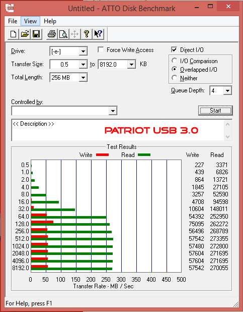 ATTO never scores as highly with USB 3.0 drives. The Patriot SuperSonic Magnum peaks at around 270 MB/s in the read test, displaying much lesser write test results.