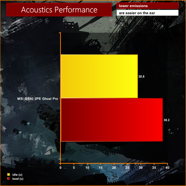 When idle, or when surfing the internet, working in Microsoft Office for example – the MSI GS60 2PE Ghost Pro is relatively quiet. Both fans spin at low spin circulating modest air across the motherboard, and through the two rear mounted heatsinks cooling the CPU and GPU.
