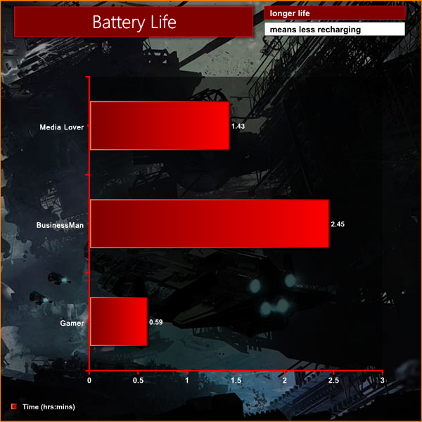 Intensive gaming duties will drain the battery quickly – in around 1 hours time going on our tests. You really will want access to a wall socket to get the most from this machine, although it is ideal for LAN gaming at a friends house for instance.