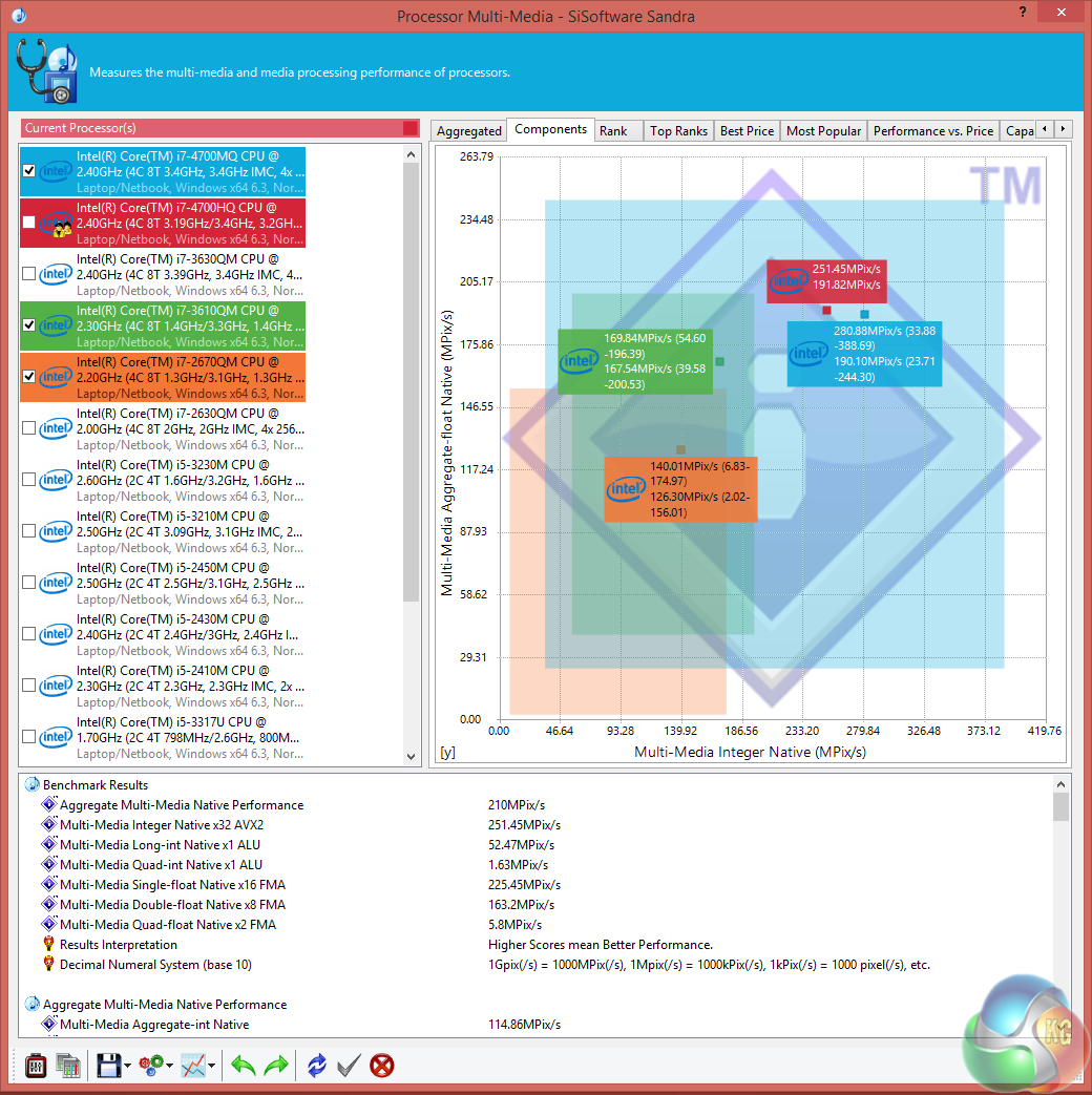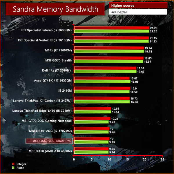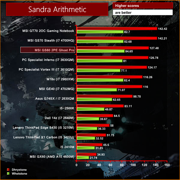As we mentioned earlier in the review, this laptop is running the memory in single channel, which is the reason for the low scores in the Sandra Memory Bandwidth test. It is unlikely to have much of an impact in our real world tests however, based on previous results. The Core i7 processor performance is excellent, as it should be.