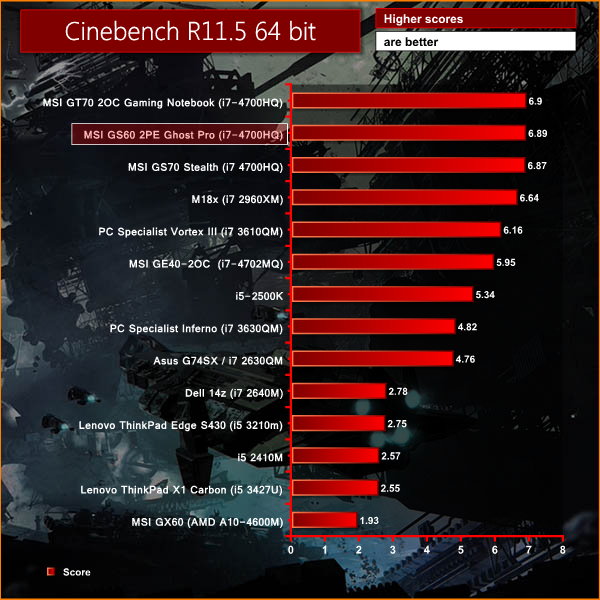 Excellent performance from the Intel Core i7 4700HQ processor, claiming a position right at the top of the chart. Even though the MSI GS60 2PE Ghost Pro could be classed as a super portable – it has the processing power to handle semi-serious 3D rendering.