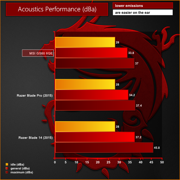 The noise emissions are reasonable, especially when factoring in the slim profile. When idle the fans spin very slowly and are basically inaudible. Under moderate load they spin quite slowly, rising to a noticeable noise level under high, sustained load – such as when gaming or 3D rendering. Not the quietest laptop we have tested but its actually fairly well balanced.