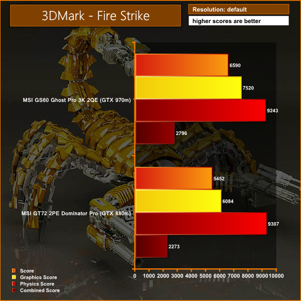A noticeable increase in performance, especially when we look at the graphics score between GTX880m and GTX970m. Around 1,500 points in favour of the newer Maxwell solution.