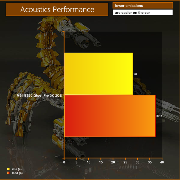 When idle, the MSI GS60 Ghost Pro 3K 2QE is almost silent. Under load, noise levels rise to 37.3dBa – clearly audible. Considering the super slim chassis, we do expect a little noise when gaming.