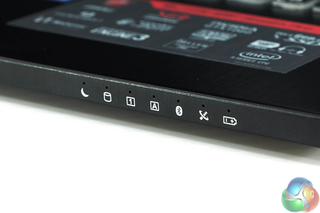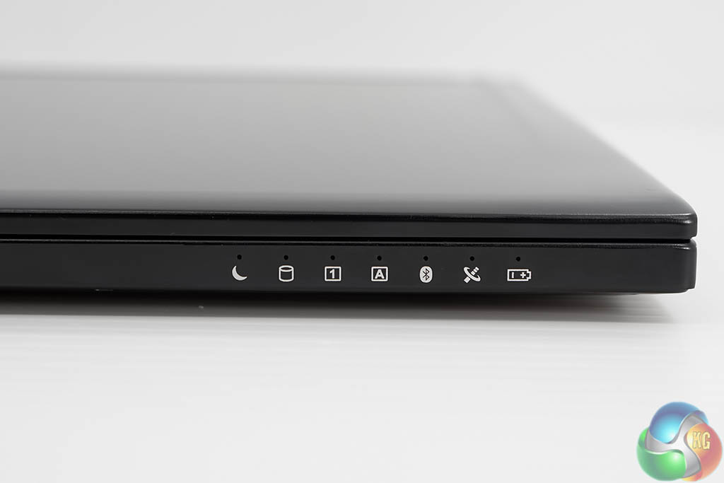 At the front of the laptop is a row of icons and LED lights. These show the activity of various states, such as caps lock, Bluetooth, wireless and battery.
