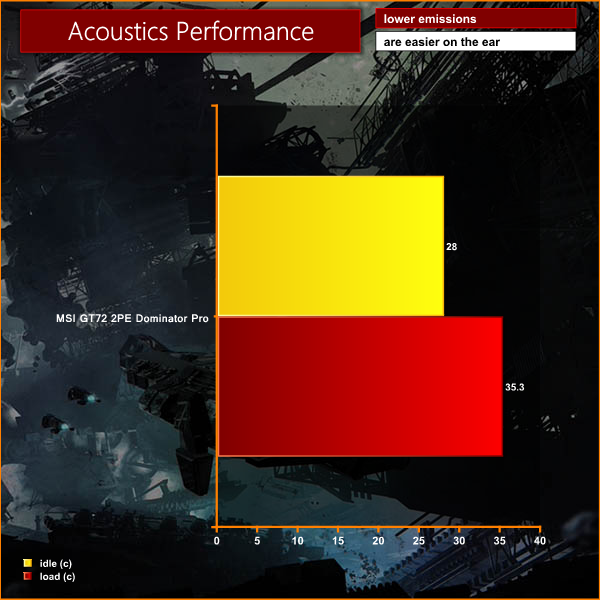 Under load the fans don't actually spin that high, thanks to the big heatsinks and copper heatpipes. Under full load it is audible, but I was surprised by the modest noise levels. MSI have created one of the quietest high performance desktop replacement laptops we have ever tested.