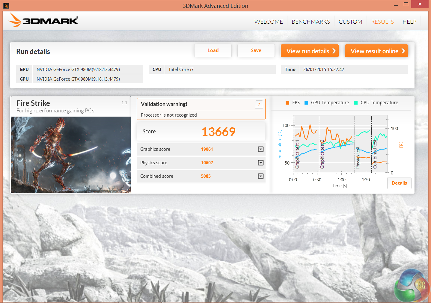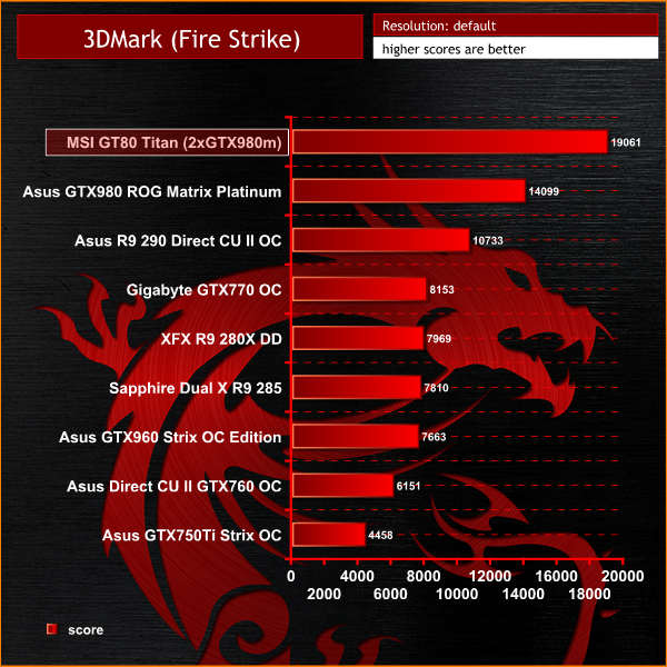 A staggering result, with both GTX980m's delivering a final graphics score of just over 19,000 points. This is around 5,000 points more than an overclocked GTX980 desktop solution.
