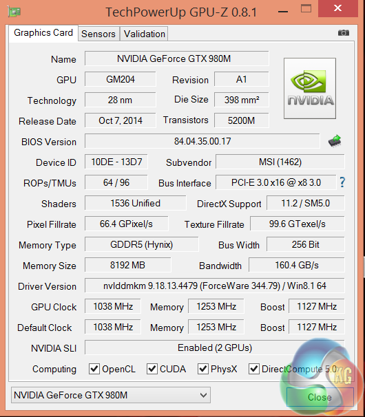 Installed inside the MSI GT80 Titan are not one, but two Nvidia GTX980m graphics cards. Each card has 1,536 CUDA cores, 64 ROPS and 96 texture units. The core is running at 1,038mhz, with a Boost speed of 1,127mhz. The memory runs at 1,253mhz (5Gbps effective). the 8GB of GDDR5 Hynix memory is connected via a 256 bit memory interface. They are in fact, two very powerful mobile GPU's. They are actually that capable that we felt it useful to compare them (in SLi) against some leading desktop graphics cards. More details below.
