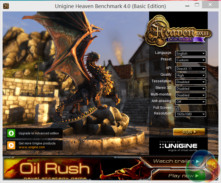 Heaven Benchmark is a DirectX 11 GPU benchmark based on advanced Unigine engine from Unigine Corp. It reveals the enchanting magic of floating islands with a tiny village hidden in the cloudy skies. Interactive mode provides emerging experience of exploring the intricate world of steampunk.