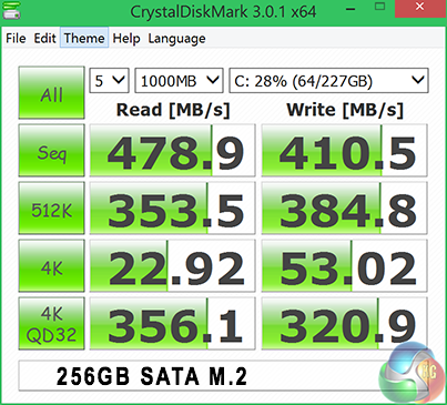 CrystalDiskMark delivers fantastic performance results, 480MB/s in the sequential read test, and 411MB/s in the sequential write test. 4K QD32 performance is equally as impressive.