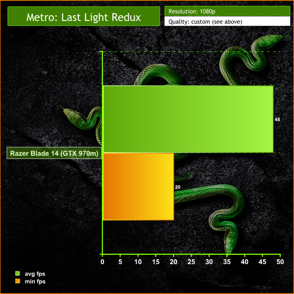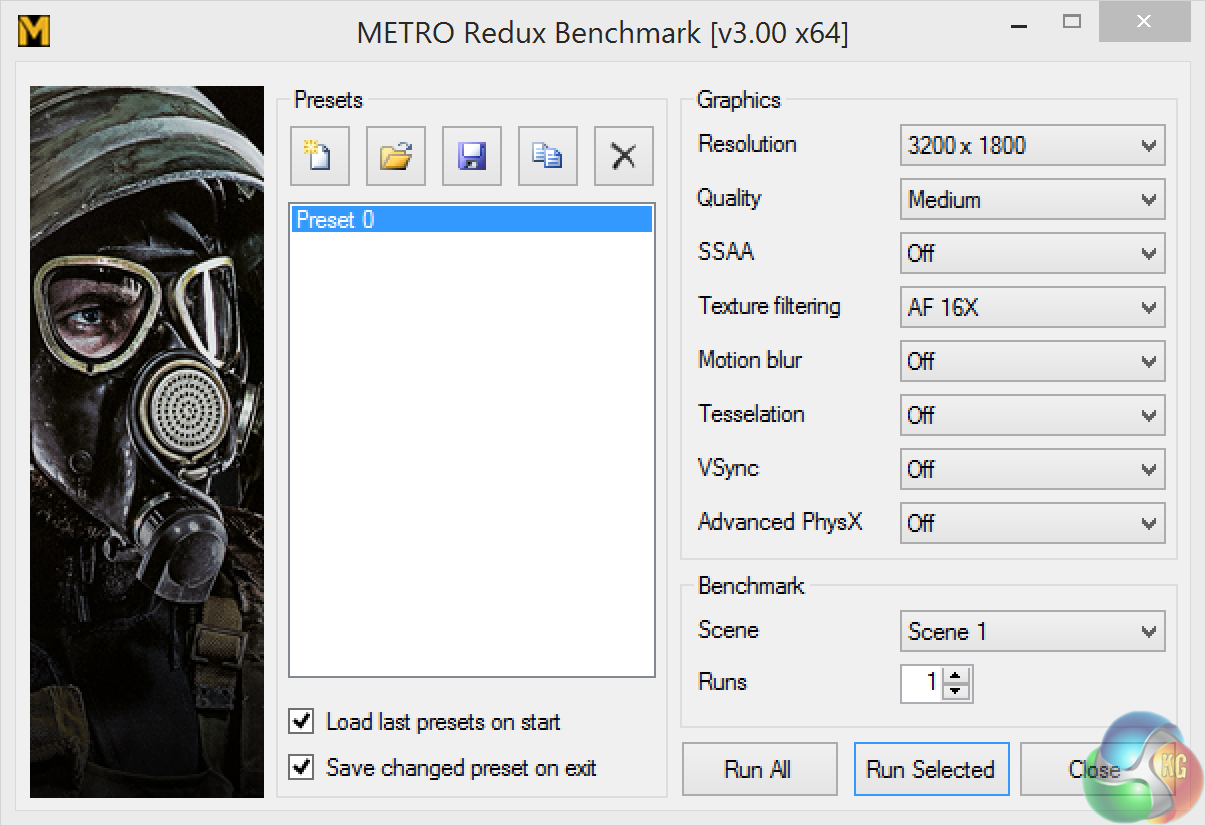 On May 22, 2014, a Redux version of Metro Last Light was announced. It was released on August 26, 2014 in North America and August 29, 2014 in Europe for the PC, PlayStation 4 and Xbox One. Redux adds all the DLC and graphical improvements. A compilation package, titled Metro Redux, was released at the same time which includes Last Light and 2033. (Wikipedia). We test with following settings at 3200×1800: quality medium, SSAA off, 16AF, Tessellation off, VSYNC off and Advanced PhysX off.