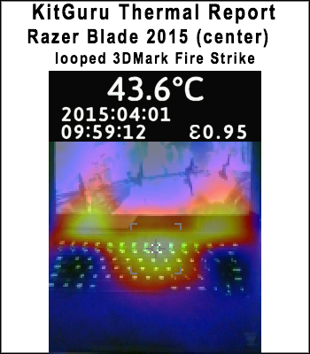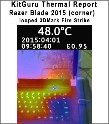 The hottest part of the system is actually the top corners, above the top row of keys. These are the exhaust areas, and they do get very warm after a short period of gaming. We measured up to 50c in parts, with an average around 48c. If you are playing games with the Blade 14 on your lap you will definitely want to to consider one of these.