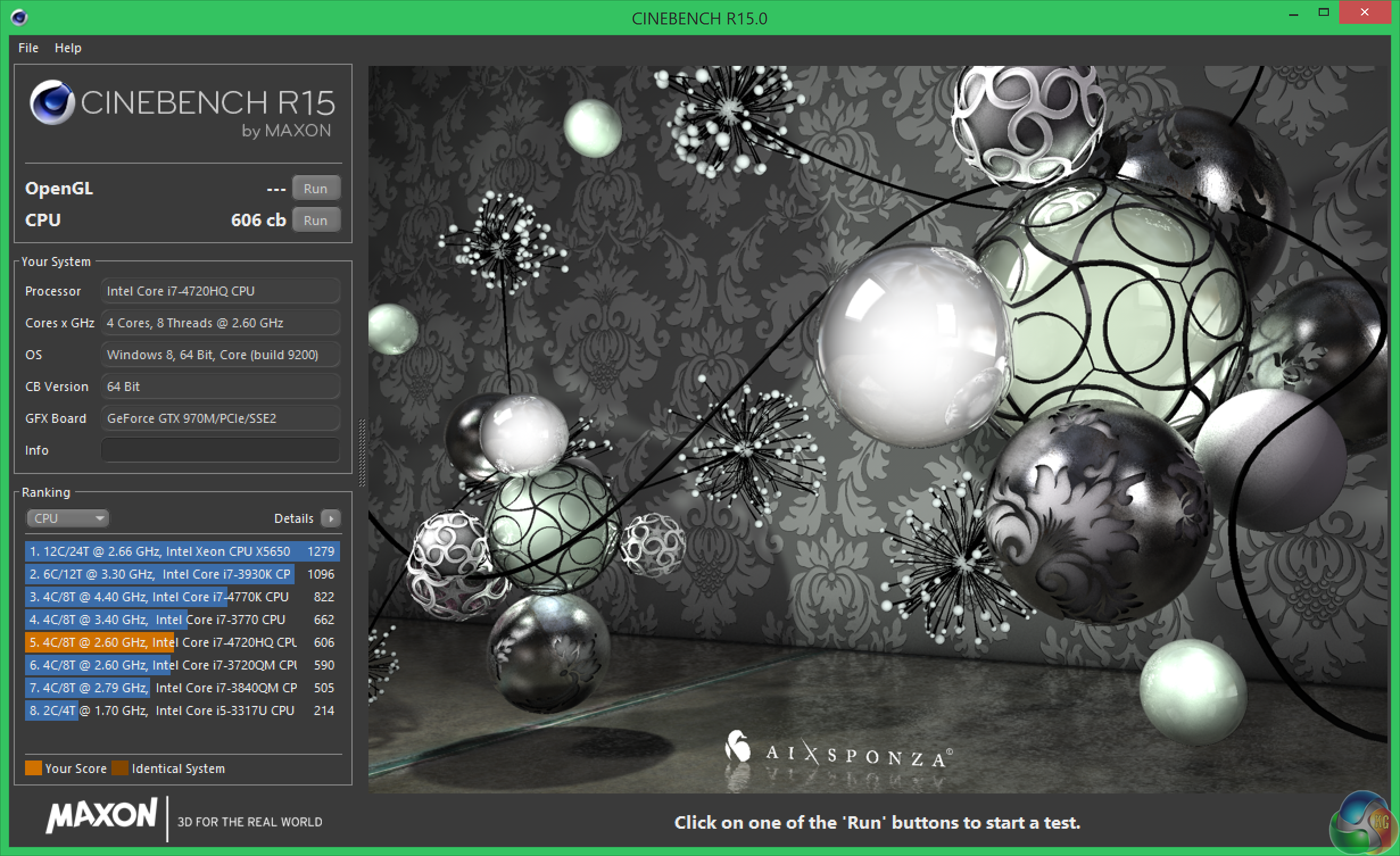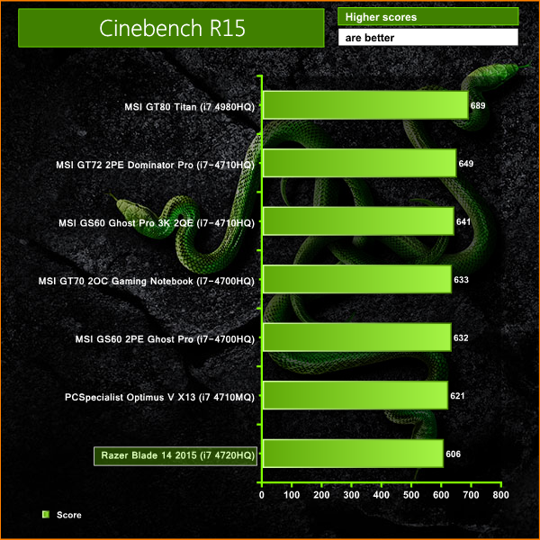 The final score of 606 is actually very good, but again below what we would expect from a 4720HQ quad core with hyperthreading. Clearly we have some heat issues in the chassis when all the cores are loaded to 100%.