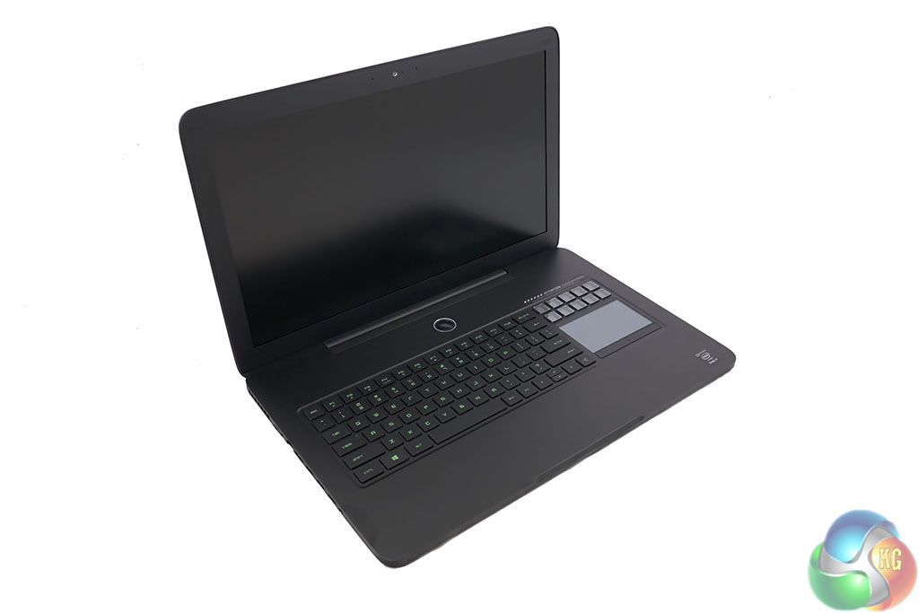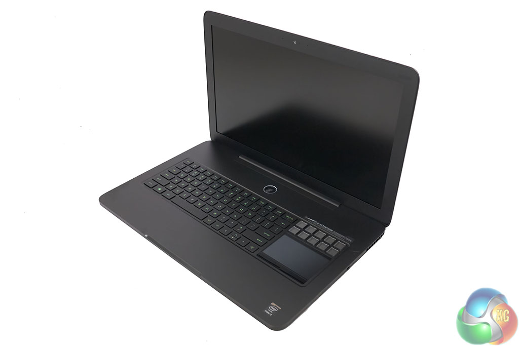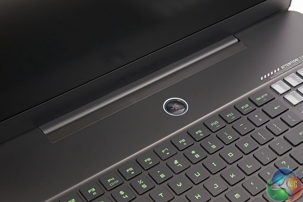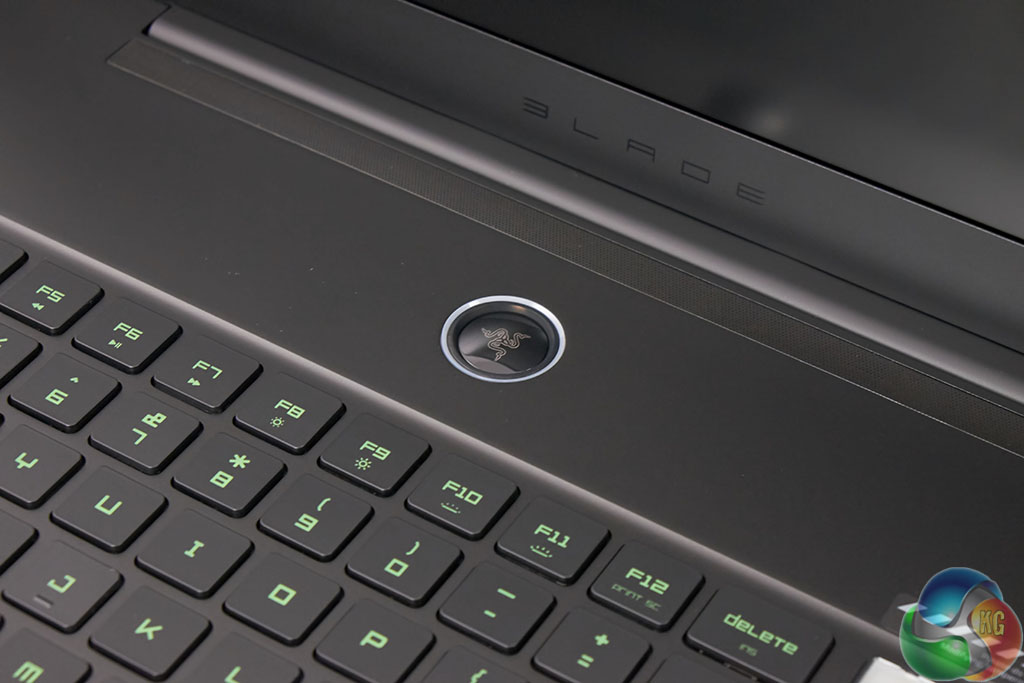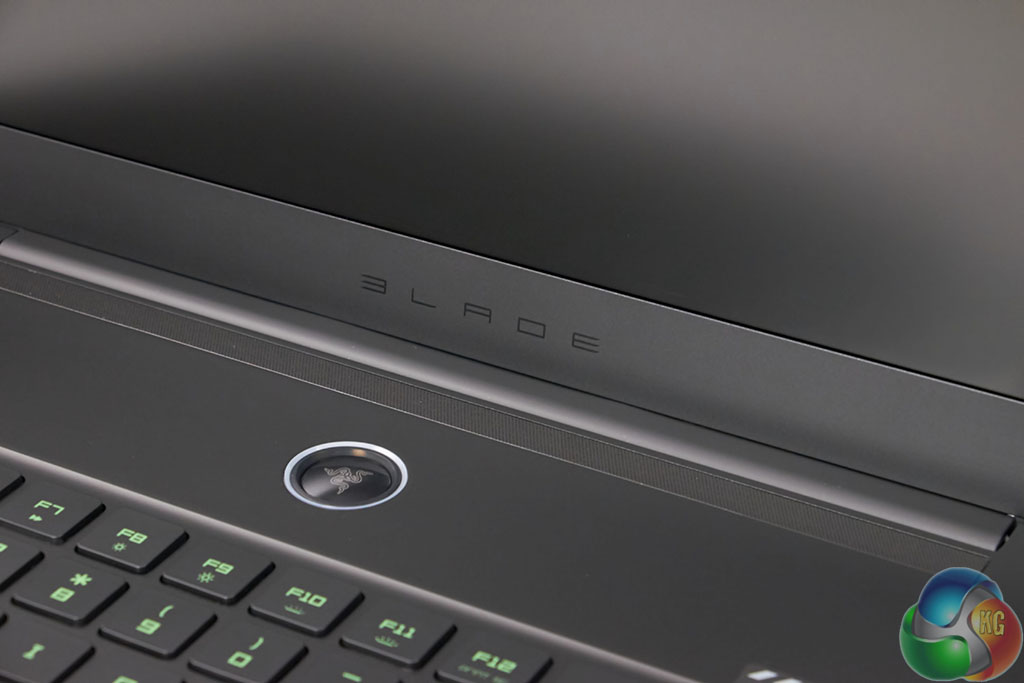 The power button is stunning, oversized, and pulses green when the machine is turned on. We like how the keys have green accenting, so even when the backlighting is off, the colour scheme is clear to see. The word ‘BLADE' is engraved into the chassis, between the power button and the panel. A speaker grill runs along the top of the laptop in front of the heavy duty hinge.