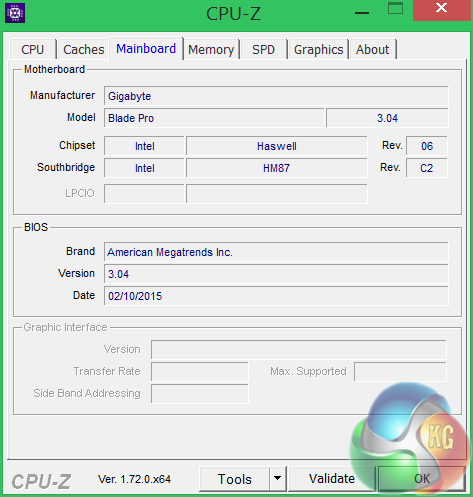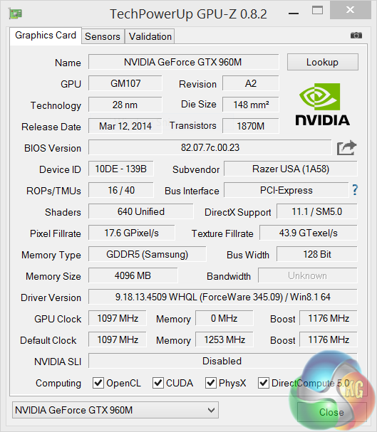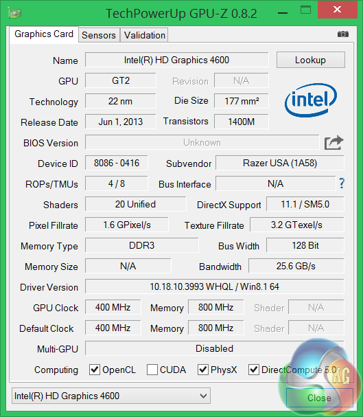 The Razer Blade Pro system has 16Gb of DDR3 memory installed, clocked at 1,600mhz. Memory timings are 11-11-11-28-1T. The system uses a combination of Intel HD4600 graphics, with the Nvidia GTX960M taking over when the demand requires.