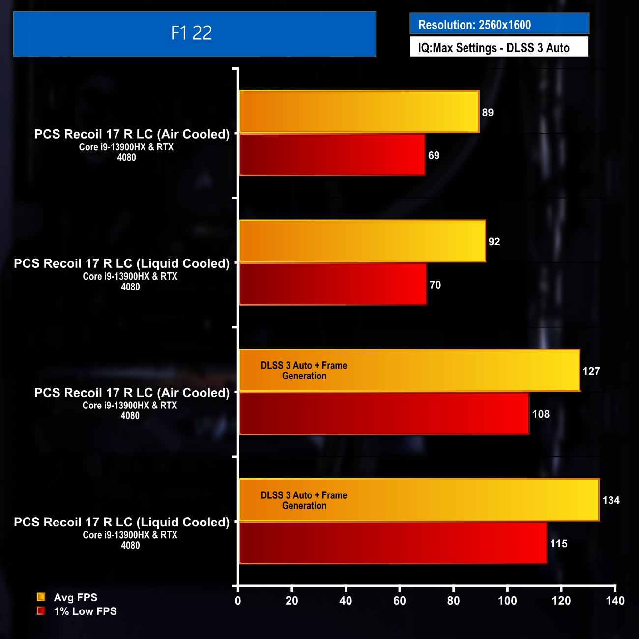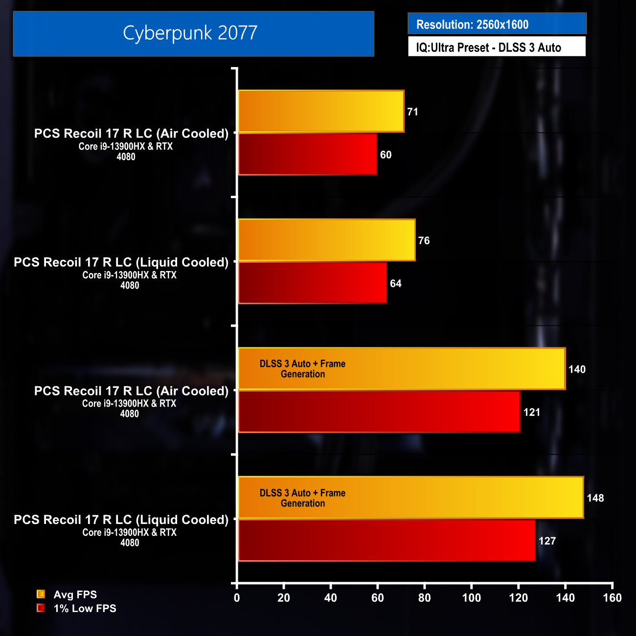 Gaming on the 2560×1600 display was a great experience during the review. The results below (at maximum settings) show that the pairing of the Intel Core-i9 13900HX and Nvidia RTX 4080 can easily deliver smooth frame rates in most titles, with DLSS 3 and frame generation helping to push this even further in supported games.