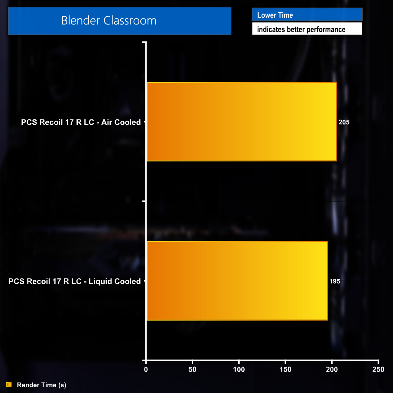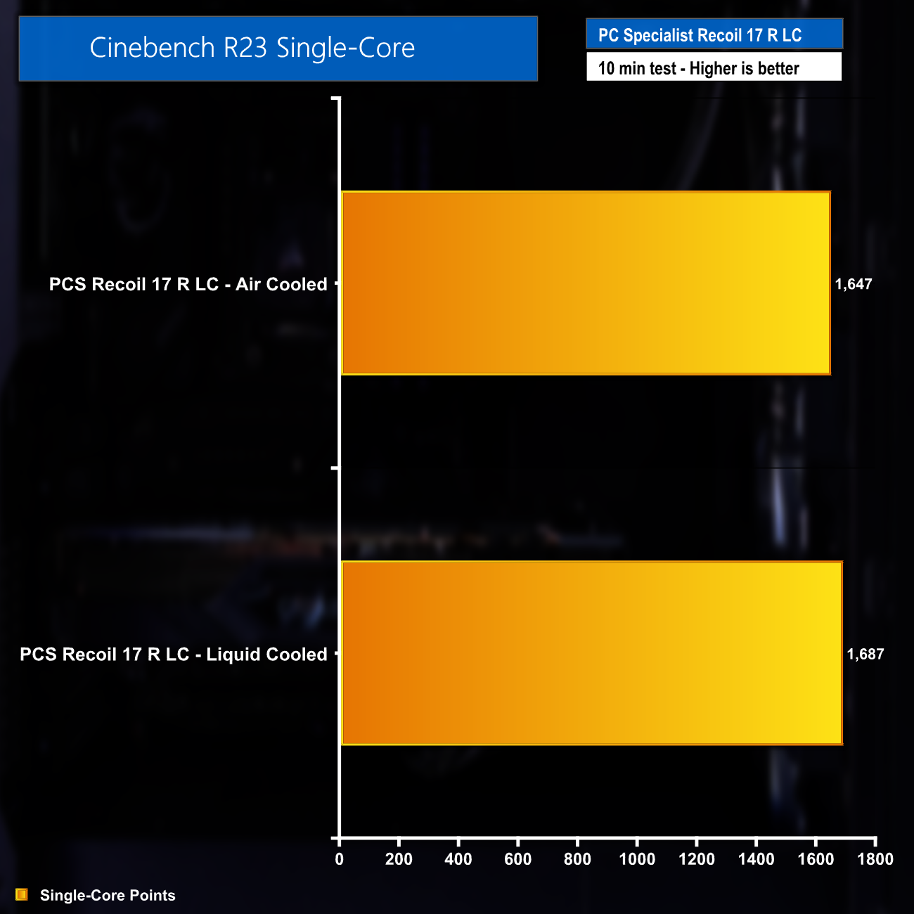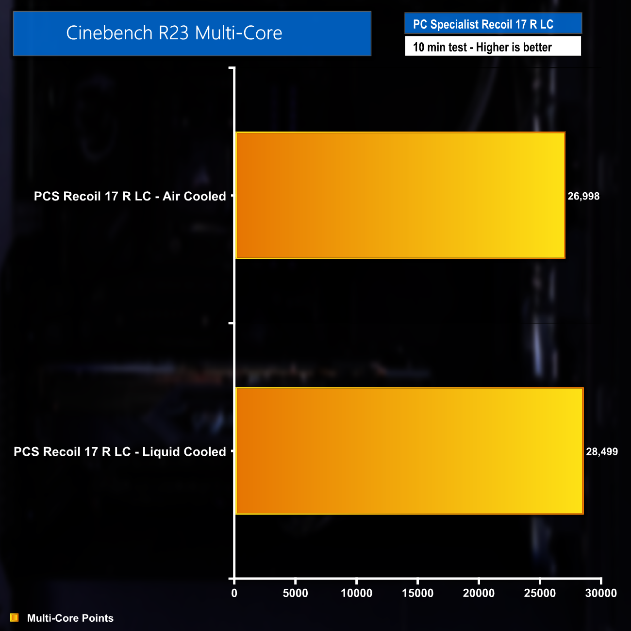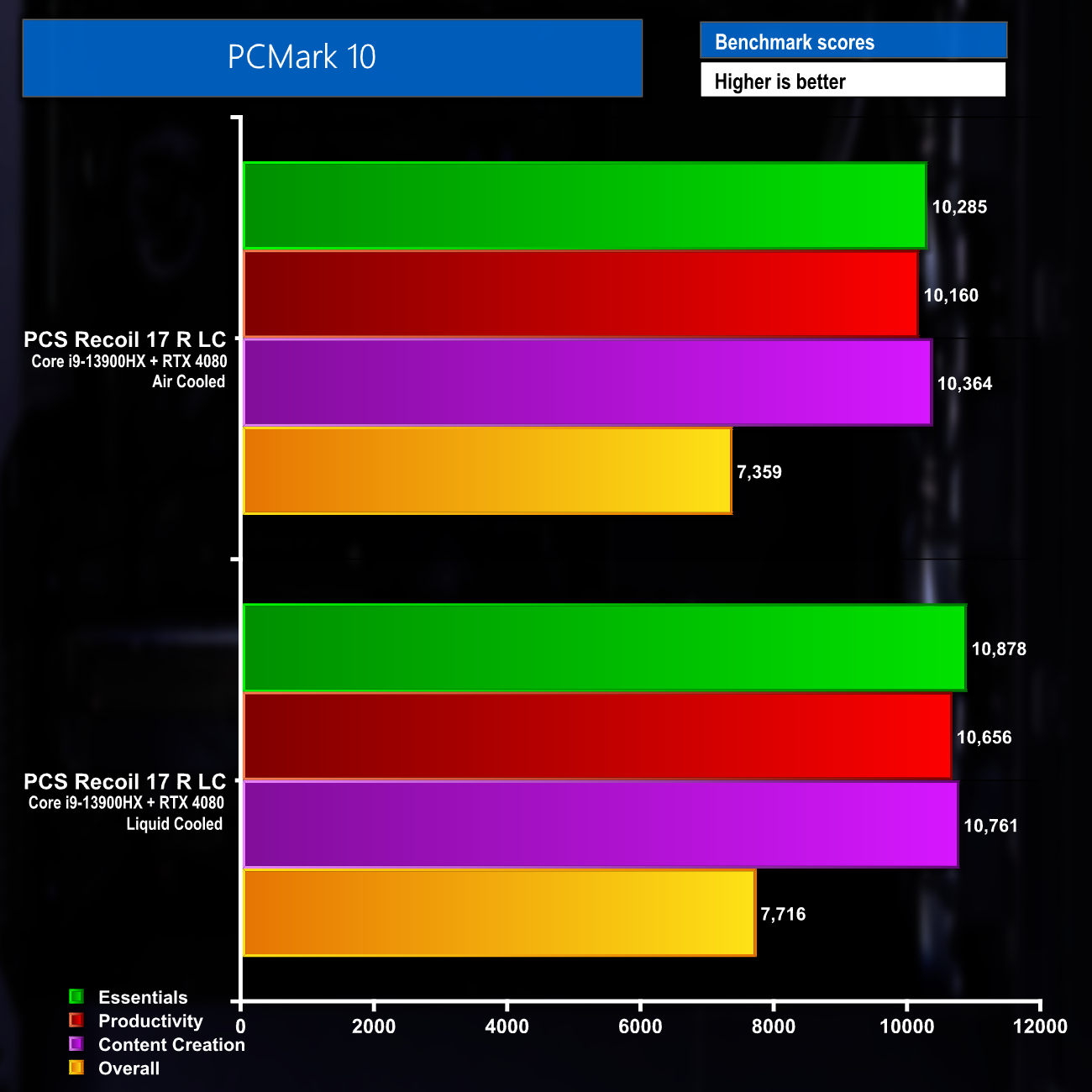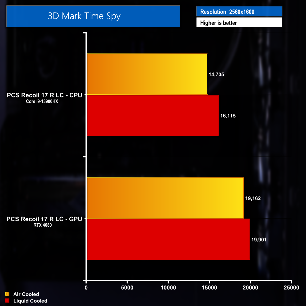 The liquid cooler enabling the CPU and GPU to maintain higher clock speeds and power usage over sustained periods resulted in some noticeable gains in various synthetic benchmarks. CPU scores in particular were higher when using liquid to cool the i9-13900HX.