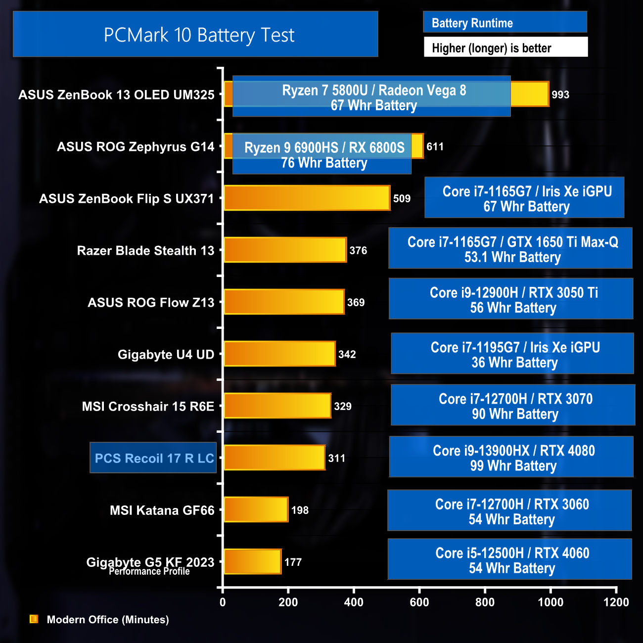 The battery managed 311 minutes in the PC Mark 10 Modern Office test. A respectable result for a laptop with a 17″ high refresh rate display.