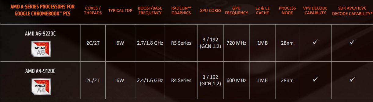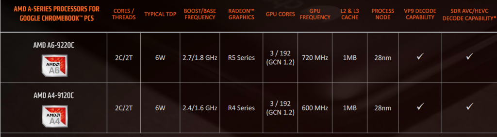 Intel has dominated the Chromebook market since its 2011 inception, with the duo-core Celeron N3350 and the quad-core Pentium N4200 being the two most common processors in models from the past two years. AMD’s new A4-9120C is compared with the former throughout internal testing, while the more premium A6-9220C is stacked against the latter.