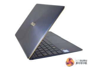 Here we get a look at the laptop with the screen titled back as far as it will go. We also get an idea of just how thin the ZenBook 3 is – 11.9mm is really impossibly thin, while the 910g weight is also mind-boggling.