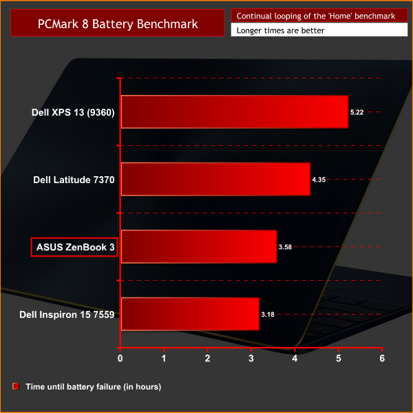 While a total time of 3:58 is still a good score, it is over an hour less than the XPS 13. This is likely a trade off for ASUS having to use a smaller battery due to the ZenBook's incredibly thin design.