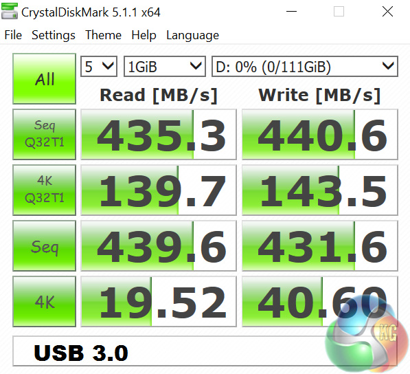 As we would expect, the USB 3.0 results are right at the limit of the 5Gbps ceiling.